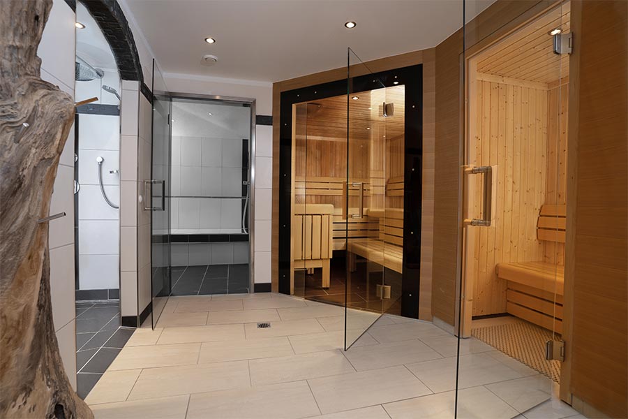 Unsere 60 m² große Wellness-Oase bietet Sauna, Dampfbad und Infrarotkabine. Im Ruheraum mit elektrischem Kamin können Sie entspannen und den Alltagsstress vergessen.